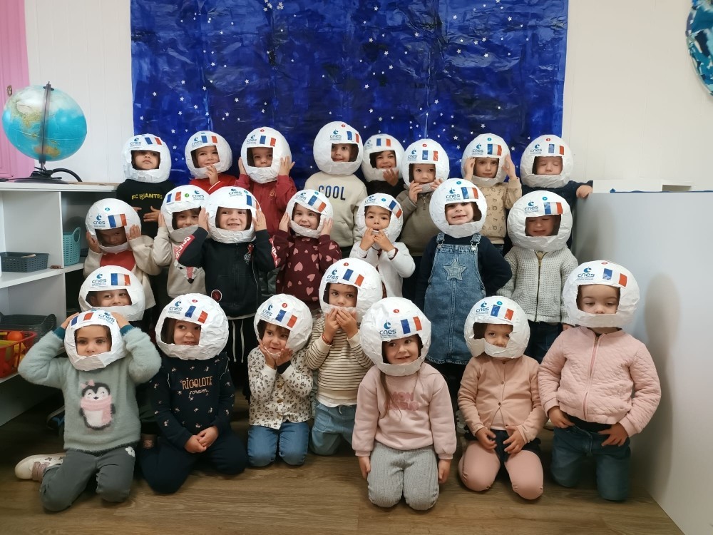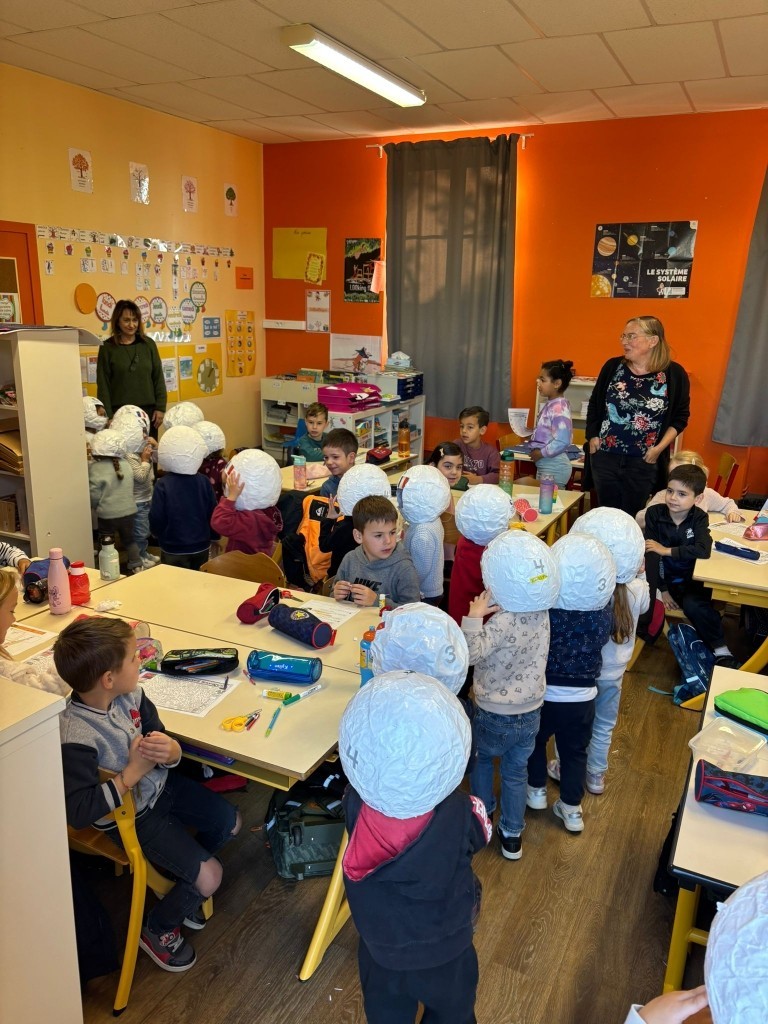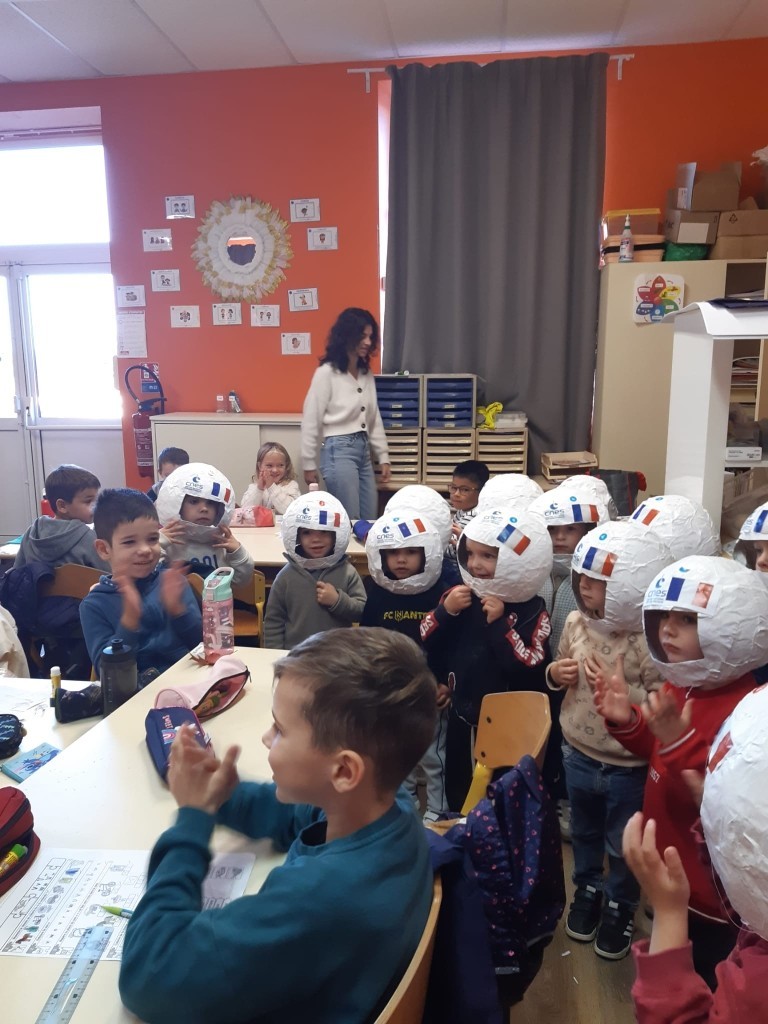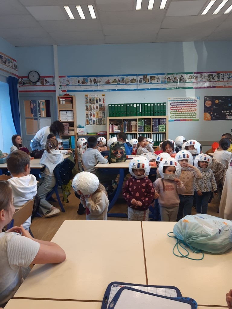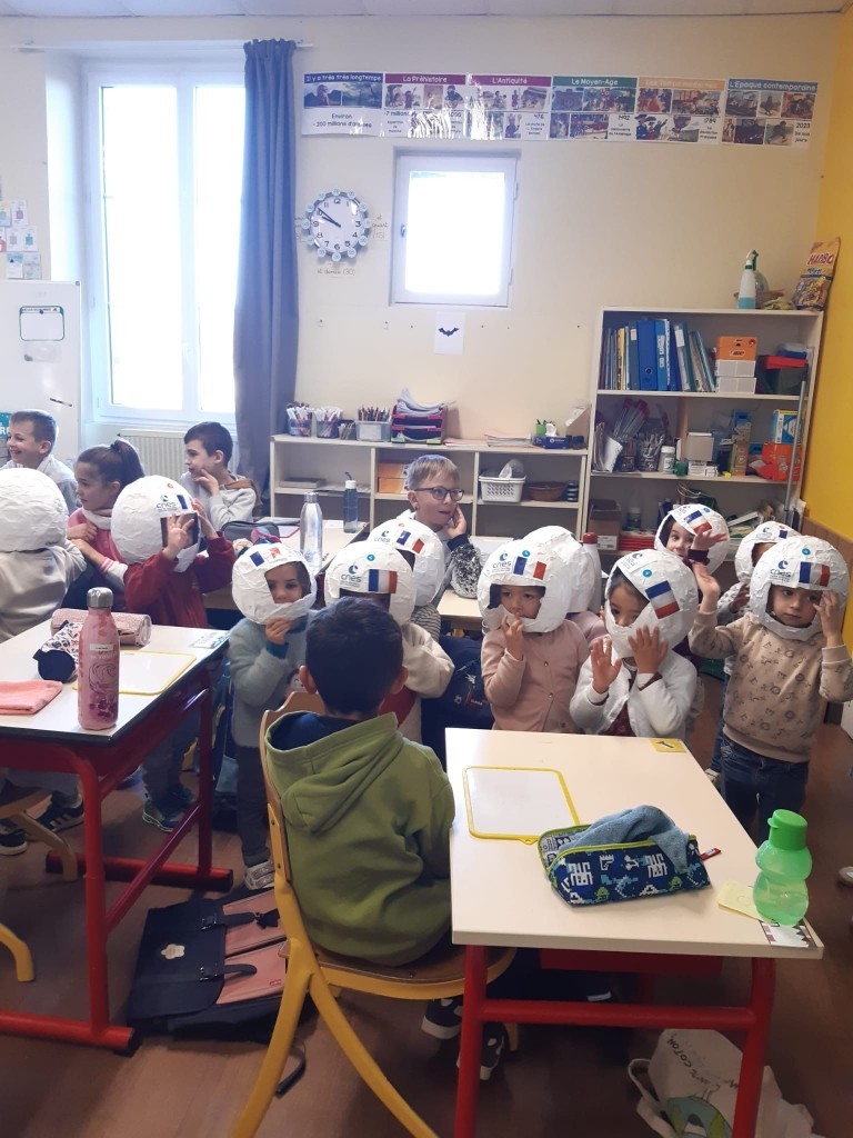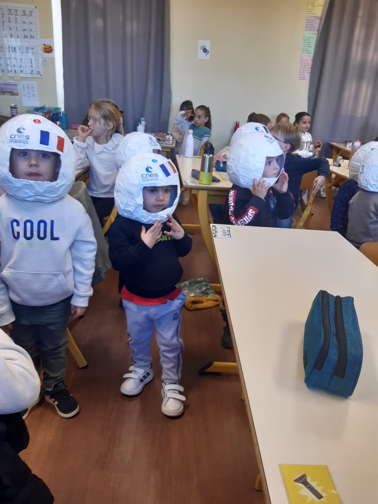 Le projet de cette année étant l’astronomie, les élèves de PS/MS ont fabriqué des casques de spationautes. Ils ont fait preuve de patience et de ténacité car ce fut un travail de longue haleine. Ils sont passés dans toutes les classes présenter leurs réalisations aux plus grands.