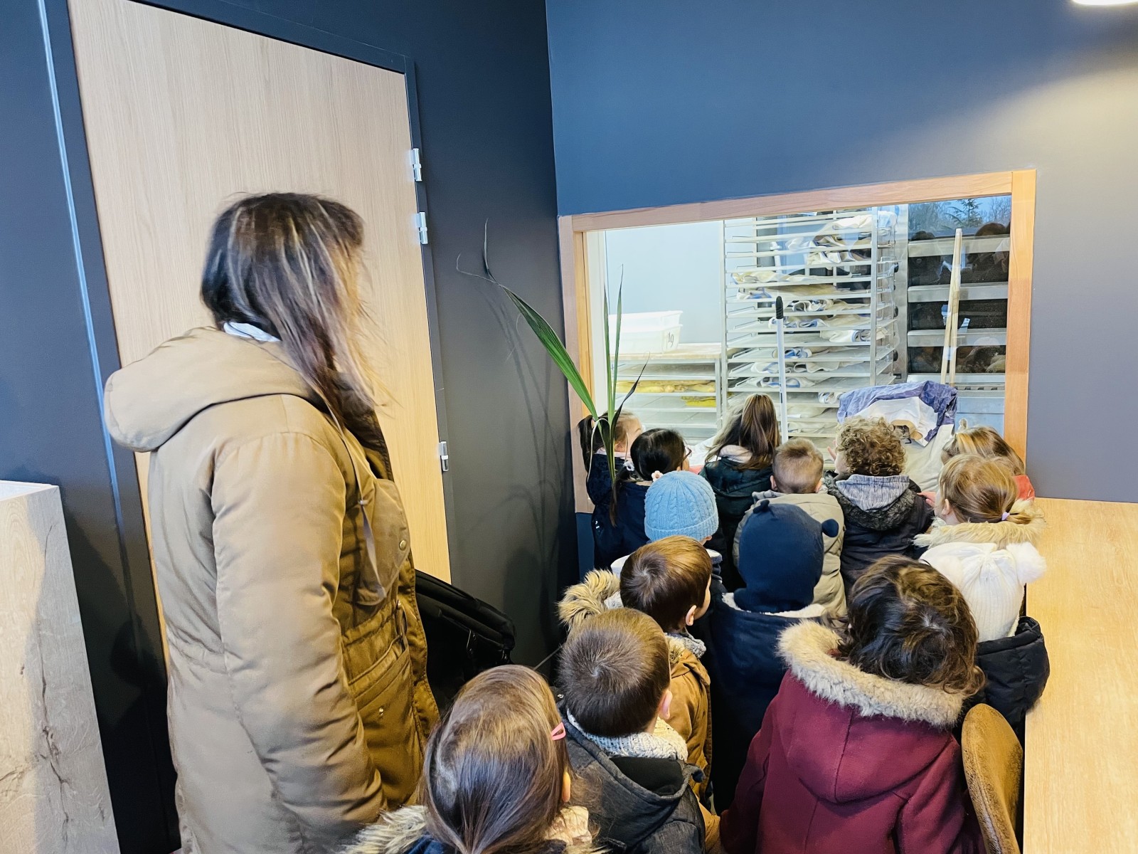 Nous avons vu la boulangère et le boulanger. A travers une vitre, nous avons aperçu le grand four et les étagères pour déposer les baguettes.