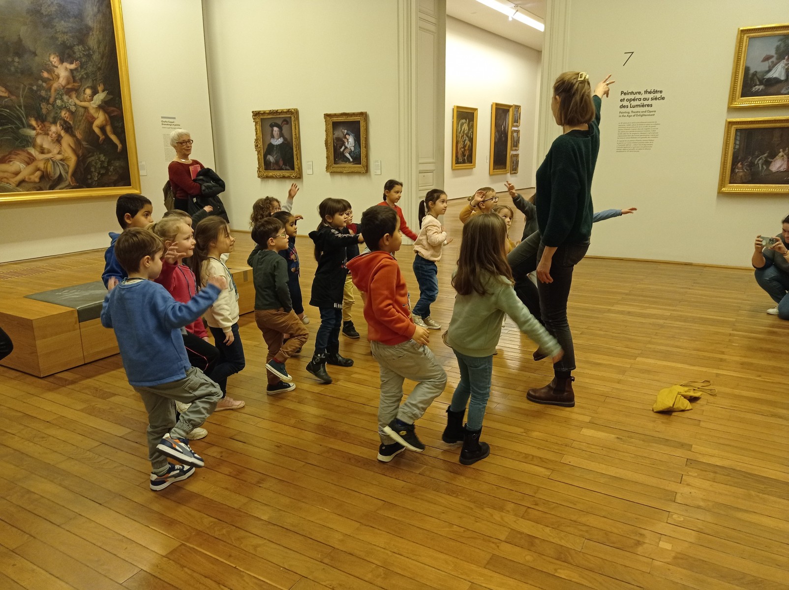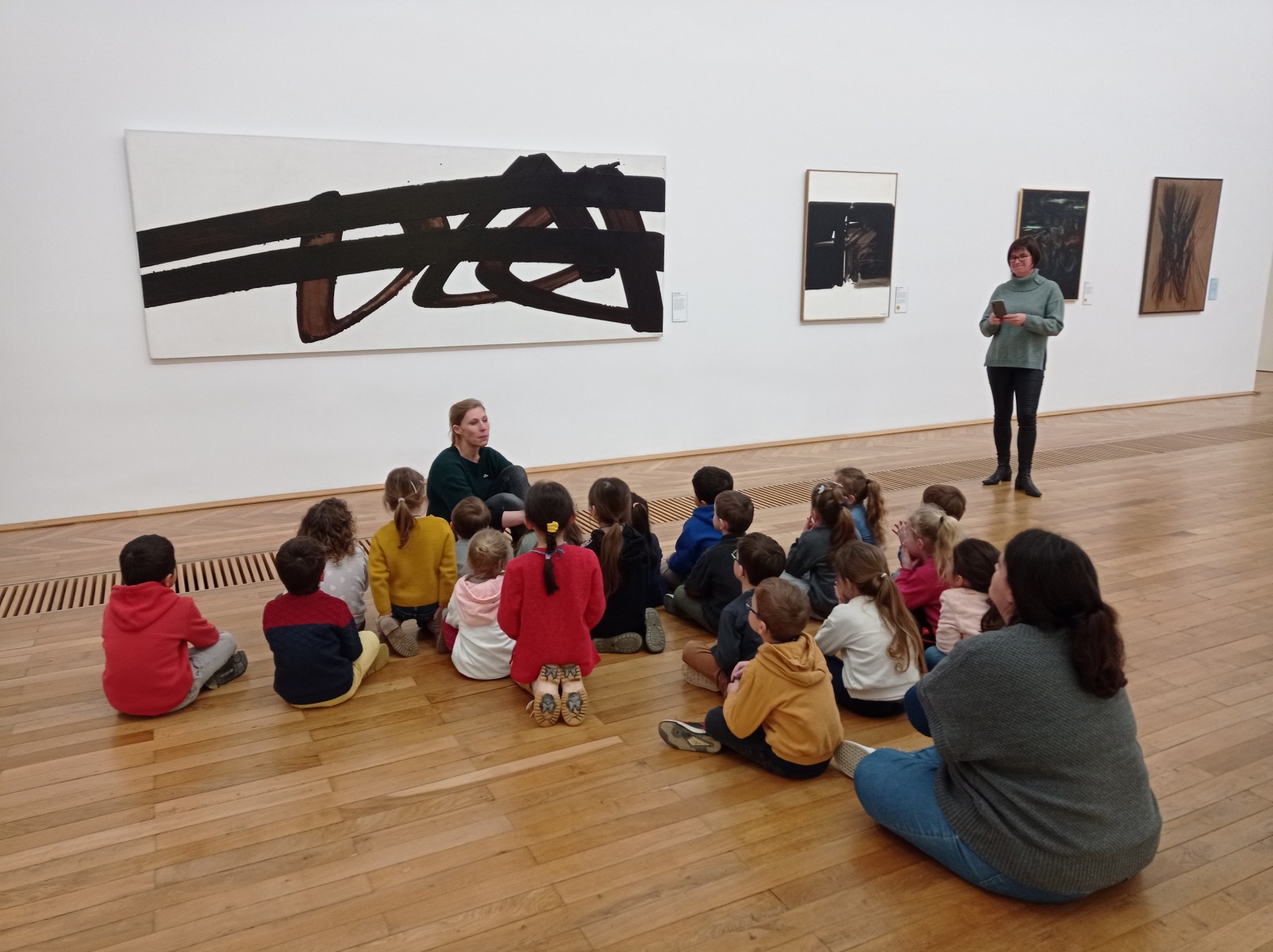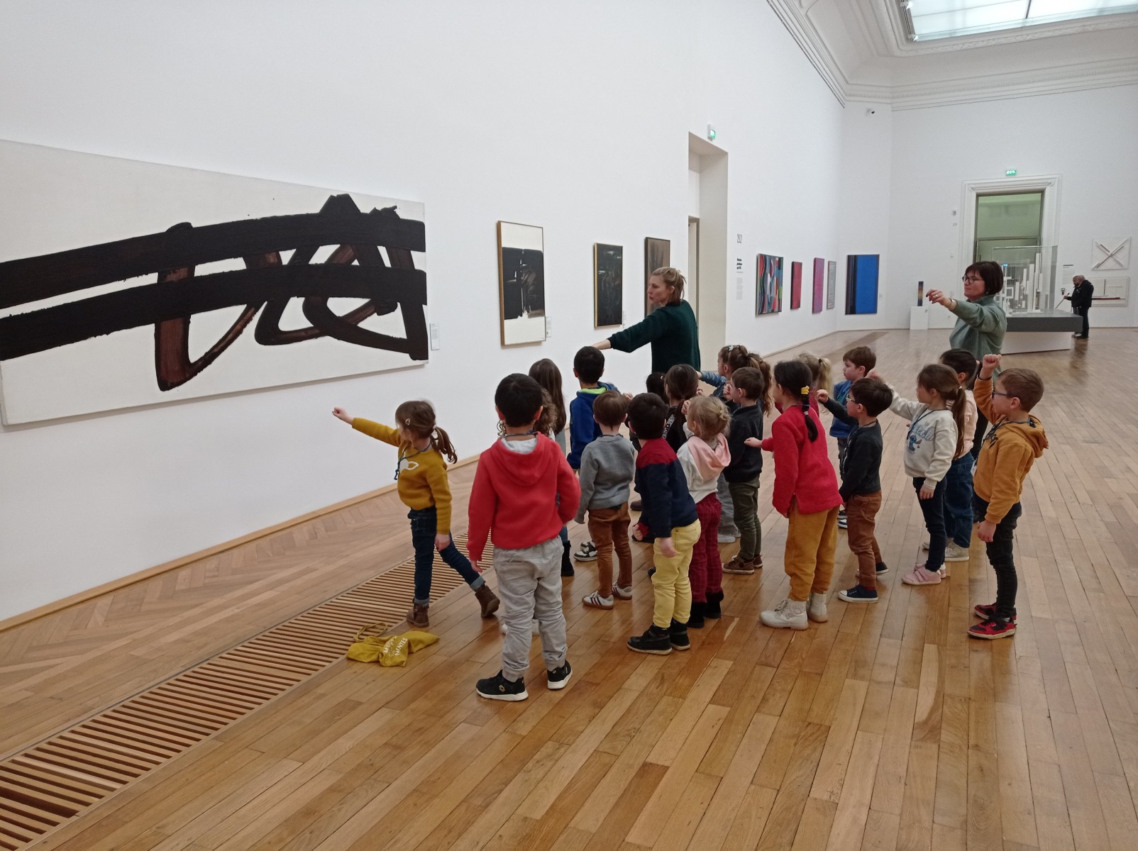 Le matin, ils ont participé à une visite guidée sur le thème du mouvement. Leur guide, Sandrine, leur a présenté des œuvres d’art abstrait illustrant le mouvement. Les enfants ont notamment suivi du doigt les traces laissées dans les œuvres de Pierre Soulages, en se déplaçant comme s’ils entraient dans le tableau.