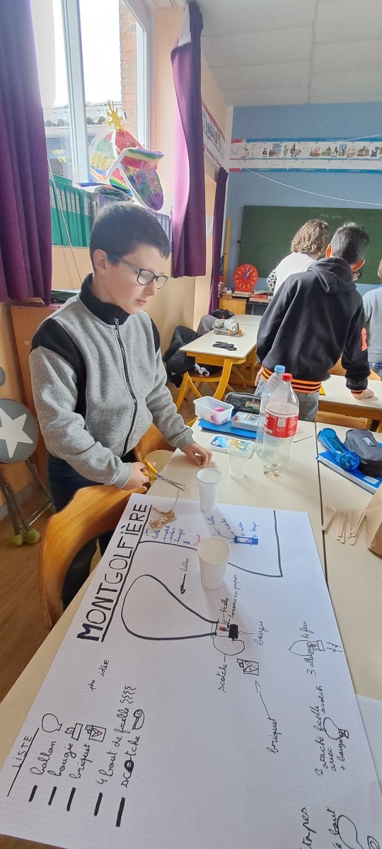 Après avoir découvert l’histoire des frères Montgolfier, leurs réussites mais aussi leurs nombreux essais, les élèves ont travaillé en groupes pour élaborer un protocole de fabrication. Chacun a imaginé et construit sa propre montgolfière en tenant compte des contraintes techniques.